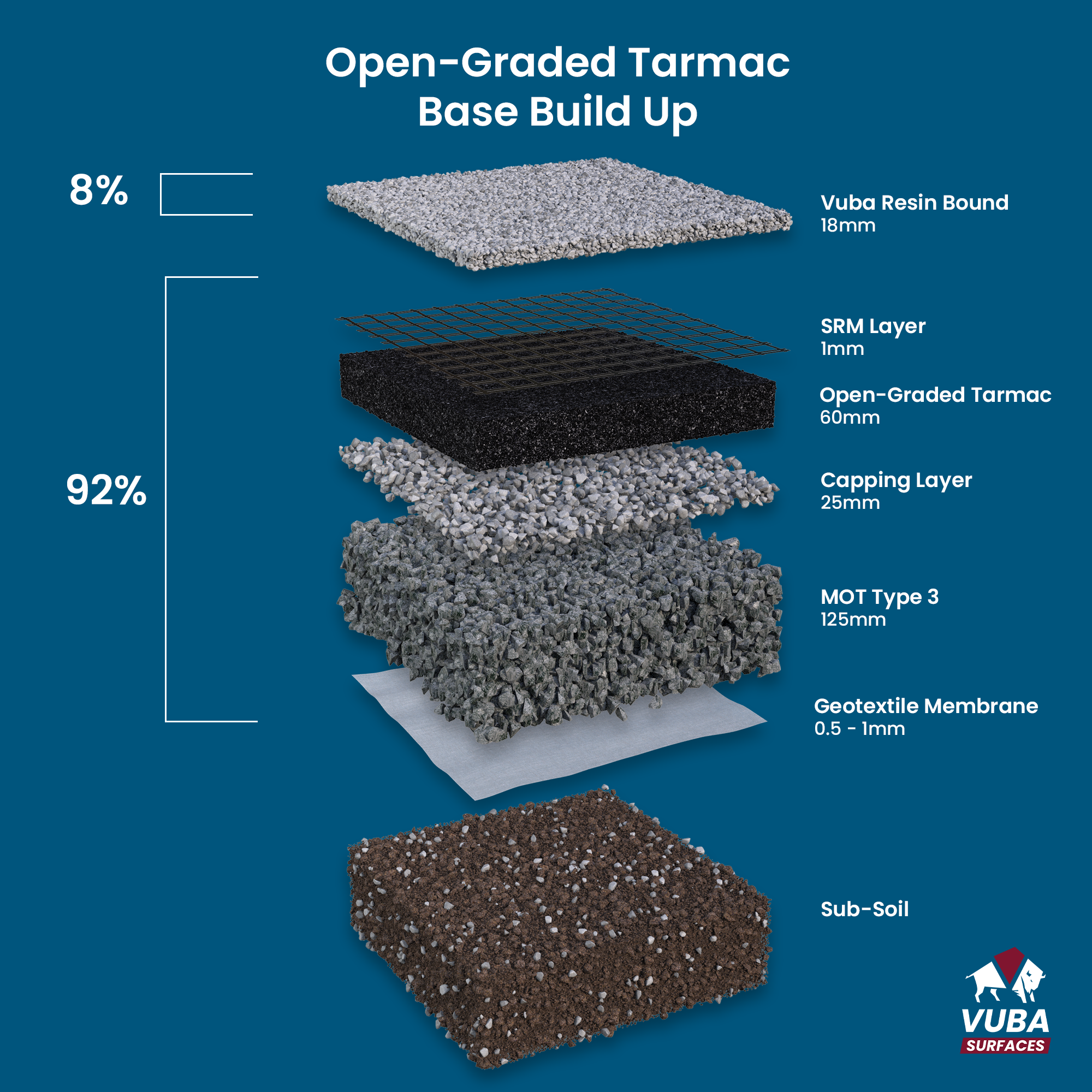The Vuba surface accounts for less than 10% of the overall recommended base build-up. This is why it is crucial that the correct standards are followed during installation. Having the proper foundations beneath the surface ensures the product will stand the test of time.